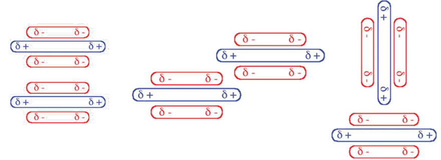 Dwie najkorzystniejsze konfiguracje układów aromatycznych to takie gdzie pierścienie aromatyczne są ustawione równolegle lub prostopadle w stosunku do siebie. Przy czym korzystniejsza energetycznie jest konfiguracja w kształcie litery T pierścieni aromatycznych. Ten rodzaj oddziaływania nie ma charakteru czysto elektrostatycznego, chociaż jeden z pierwszych modeli postulował oddziaływanie pomiędzy układem sprzężonym elektronów π pierścienia i elektronami σ wiązań C–H. Ponieważ cząsteczka benzenu nie posiada momentu dipolowego, wykazuje natomiast znaczny moment kwadrupolowy, należy przy rozpatrywaniu tego oddziaływania uwzględnić wzajemne przyciąganie i odpychanie momentów kwadrupolowych i wpływ sił Londona. Wiązania C–H wykazują lokalne momenty dipolowe, które powodują, że na nich zlokalizowany jest cząstkowy ładunek dodatni i odpowiedni ładunek ujemny ponad i pod płaszczyzną pierścienia. W związku z tym równoległe ułożenie pierścieni aromatycznych jest stabilizowane siłami dyspersyjnymi Londona i destabilizowane przez wzajemne oddziaływanie kwadrupolowe. To tłumaczy większą stabilność prostopadłej konfiguracji dimeru w stosunku do równoległego ułożenia cząsteczek benzenu. Takie przedstawienie sił działających w układach warstwowych wyjaśnia również wzajemne przesunięcie pierścieni przy równoległym ułożeniu cząsteczek oddziałujących związków. Łatwiej to zrozumieć gdy przedstawimy rozkład ładunku (momentu kwadrupolowego) na cząsteczkach związków uwzględniając wpływ podstawników stabilizujących lub destabilizujących układ aromatyczny.