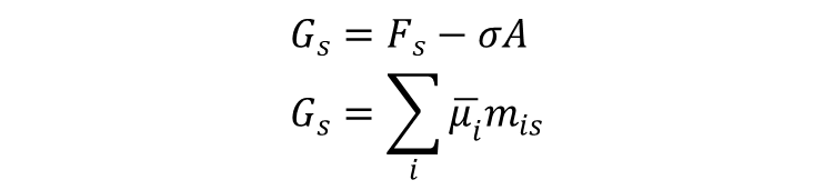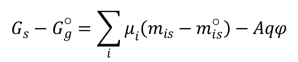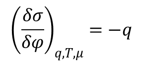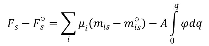 gdzie Gs - entalpia swobodna powierzchni; Fs - energia swobodna powierzchni; σ - napięcie powierzchniowe; A - pole powierzchni międzyfazowej; mis - nadwyżkowe w ujęciu Gibbsa ilości jonów przypadające na powierzchnię o polu A; ūi = μi + qiφ - potencjał elektrochemiczny jonów "i", przy czym μsoli = μ+ + μ– dla elektrolitu z -wartościowego, μi - potencjał chemiczny jonu, qi - ładunek jonu. Wyrażenie na ładunek powierzchniowy metalu, kompensowany nadwyżką jonów przeciwnego znaku w roztworze ma w tym przypadku postać: