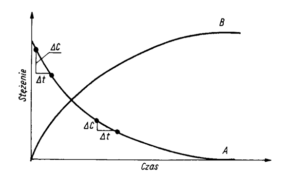 Stężenia i szybkość reakcji zmieniają się w czasie zgodnie z równaniem kinetycznym, tak jak to pokazano na rysunku obok. Ponieważ pomiędzy A i B istnieje zależność stechiometryczna to szybkość przemiany chemicznej można opisać jako szybkość zaniku A, albo jako szybkość przyrastania B. Jak widać szybkość zmiany stężenia A nie jest stała, a można ją opisać poprzez zmniejszenie się nachylenia krzywej w miarę upływu czasu. Matematycznie określa to pochodna opisana wzorem: