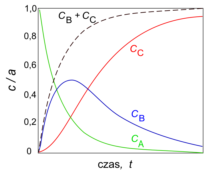 Produkt pośredni B (produkt reakcji 1 i substrat reakcji 2) początkowo gromadzi się w układzie, ponieważ szybkość reakcji A → B jest większa od B → C. W tym okresie zmniejsza się stężenie cA, a stężenie cB rośnie, co powoduje zmniejszanie się szybkości reakcji 1 i wzrost szybkości reakcji 2 (powstawanie produktu końcowego C). W kolejnym okresie stężenie cA zbliża się do zera, a cB osiąga wartość maksymalną w danych warunkach zewnętrznych. W następnym okresie obserwuje się stopniowe zmniejszanie się stężenia cB i wzrost stężenia cC,