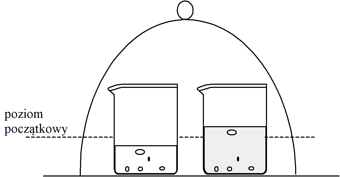 Interesuje nas jak zmieniają się właściwości rozpuszczalnika po dodaniu do niego substancji rozpuszczonej. Rozpatrzmy następujące doświadczenie. Dwie zlewki, z których jedna zawiera czysty rozpuszczalnik (np. wodę) a druga roztwór jakiejś substancji w tym rozpuszczalniku zostały umieszczone pod kloszem tak jak to przedstawiono na rysunku.