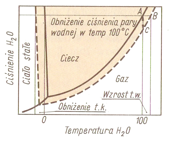 Na rysunku obok przedstawiono wykres fazowy, na którym widoczny jest typowy wpływ nielotnej substancji rozpuszczonej o określonym stężeniu na właściwości rozpuszczalnika jakim jest woda. Linie ciągłe przedstawiają wykres fazowy dla czystej wody, a przerywane dla roztworu. Jak widać w przypadku roztworu obszar cieczy jest szerszy tak dla niższych jak i wyższych temperatur w porównaniu do czystego rozpuszczalnika. Jak wynika z rysunku w temperaturze 100°C ciśnienie pary wodnej nad roztworem jest mniejsze od 101 325 Pa (1 atm.) i roztwór nie wrze w tej temperaturze lecz wyższej, w której ciśnienie pary osiągnie odpowiednią wartość. Podobnie wygląda sprawa z temperaturą krzepnięcia, która w roztworze jest niższa niż dla czystego rozpuszczalnika. Obniżenie ciśnienia pary rozpuszczalnika nad roztworem ujmuje prawo Raoulta, według którego częściowe obniżenie ciśnienia pary rozpuszczalnika równa się ułamkowi molowemu substancji rozpuszczonej. Można to zapisać w postaci: