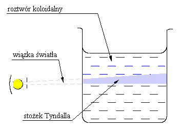 Jeżeli wiązka światła jest przepuszczana przez roztwór rzeczywisty lub czysty rozpuszczalnik to patrząc z boku nie można jej dostrzec. Jeżeli jednak wiązka światła pada na roztwór koloidalny to można ją zaobserwować z boku. Efekt ten jest nazywany efektem Tyndalla. Zjawisko związane jest z uginaniem się promieni na cząstkach fazy rozproszonej. Intensywność tego zjawiska jest tym większa, im większa jest różnica między współczynnikiem załamania fazy rozproszonej i ośrodka dyspersyjnego. Zależy również od długości rozpraszanej fali – silniej rozpraszane są krótsze. Obserwacja stożka Tyndalla pod mikroskopem oczywiście nie pozwala na zauważenie cząstek koloidalnych, ale ich położenie daje się określić na podstawie pojawiania się punktów światła. Obserwowane cząstki podlegają ruchom Browna. Gdy koloid jest przechowywany w nieizolowanym pojemniku to nie wykazuje on skłonności do rozdzielania się faz. Natomiast w koloidzie w dobrze izolowanym pojemniku po pewnym czasie następuje rozdzielenie faz. Jest to spowodowane działaniem dwóch przeciwstawnych czynników jakimi są siła przyciągania ziemskiego powodująca opadanie cięższych cząstek (faza rozporoszona) oraz rozpraszaniem pod wpływem ruchów Browna. W przypadku koloidu znajdującego się w nieizolowanym pojemniku prądy konwekcyjne wywoływane przez różnice temperatury w poszczególnych miejscach roztworu zapobiegają separacji faz.