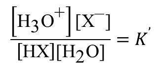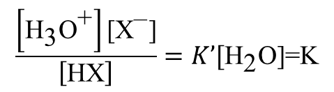 Równanie to można uprościć uwzględniając, że w roztworach wodnych zazwyczaj cząsteczki H2O występują w nadmiarze. W takich reakcjach dysocjacji HX, jak omawiana, tylko niewielka część cząsteczek wody zostaje zużyta. W związku z tym stężenie H2O można uważać za stałe. Powszechnie przyjmuje się, że stężenie H2O jest stałe i może zostać połączone z K’. Można więc zapisać wyrażenie na stałą w następujący sposób: