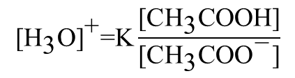 Po rozwiązaniu tego równania dla jonu hydroniowego widzimy, że stężenie jonów H3O+ zależy od stałej K i od stosunku niezdysocjowanego kwasu octowego do stężenia jonów octanowych: