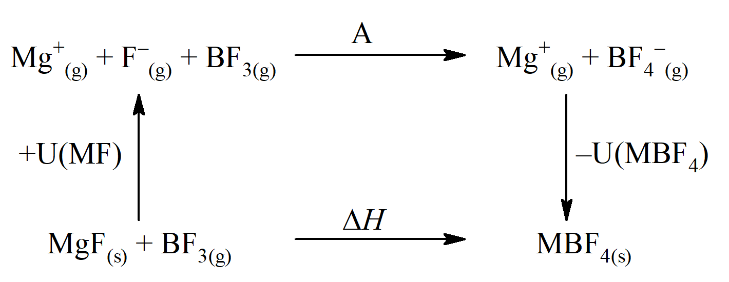 Zastosowanie modelu jonowego do opisu termodynamiki reakcji: MFs) + BF3(g) → MBF4(s), wymusza użycie wyrazów opisujących energię sieci (U) oraz ciepło asocjacji (A) pomiędzy F– i BF3. Odpowiedni cykl termodynamiczny dla tej reakcji jest następujący: