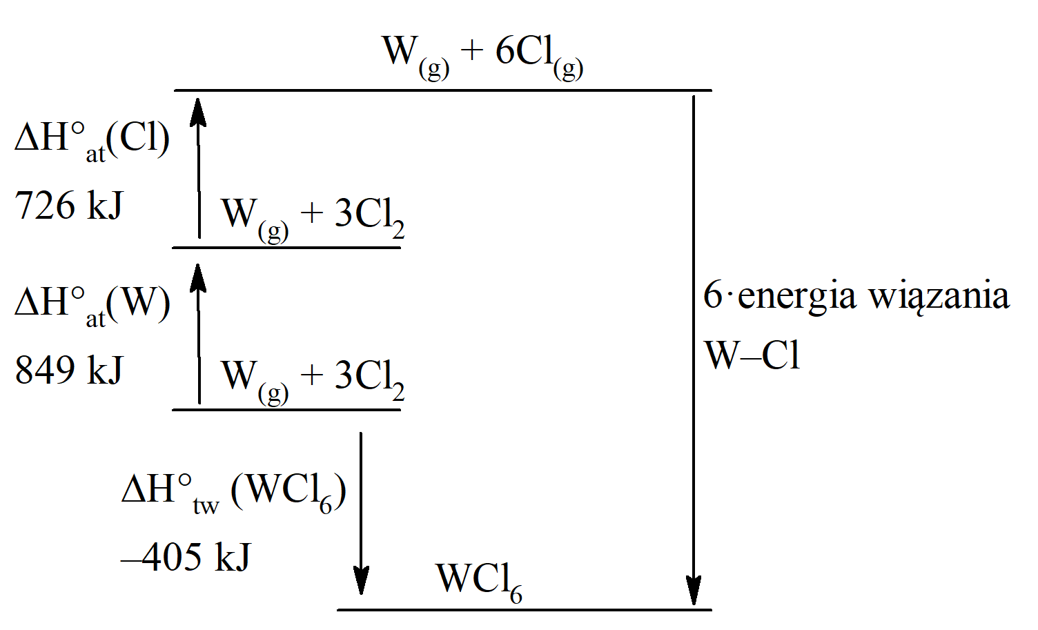 Na podstawie znajomości ciepła tworzenia WCl6 oraz ciepeł atomizacji wolframu i chloru można obliczyć energię wiązania W–Cl.