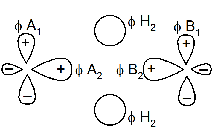 Z chemicznego punktu widzenia terminalne wiązania B–H nie wykazują żadnych odstępstw, w związku z czym można uprościć omawianie cząsteczki zakładając, że te wiązania mają typowy dwuelektronowy charakter. Ponadto wartość kąta H–B–H równa 120° sugeruje, że terminalne wiązania B–H są tworzone przez atom boru o hybrydyzacji sp2. W wiązaniach, w których udział biorą mostki wodorowe należy brać pod uwagę: zhybrydyzowane orbitale sp2 boru (oznaczone na rysunku jako fA2 i fB2) nie uczestniczące w wiązaniu końcowych atomów wodoru, orbitale p, które nie partycypują w orbitalach zhybrydyzowanych (φA1 iφfB1), oraz dwa orbitale mostkowych atomów wodoru (φH1 i φH2). Mamy zatem 6 orbitali, które w polu o symetrii D2h mogą ulegać rozszczepieniu. Pomijając rozszczepienie zauważmy, że φA2 i φB2 oraz kombinacja (φH1 + φH2) są symetryczne względem obrotu wokół osi B–B, podczas gdy φA1, φB1 oraz kombinacja (φH1 – φH2) są antysymetryczne. W związku z tym te dwa zbiory orbitali będą wzajemnie ortogonalne. W obrębie tych kombinacji trzy orbitale utworzą wiążące, niewiążące i antywiążące orbitale cząsteczkowe. Orbitale wiążące i niewiążące zostały przedstawione na poniższym schemacie: