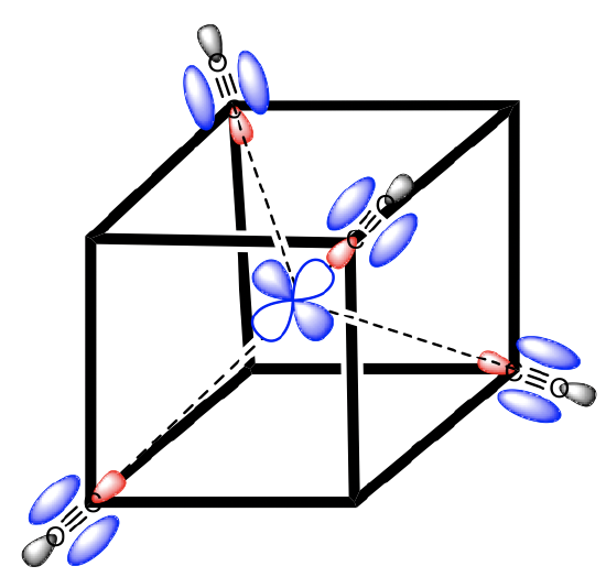 Teraz musimy określić typy symetrii orbitali granicznych metalu. W przypadku czwartego okresu orbitalami walencyjnymi są 3d, 4s i 4p. Orbital 4s jest pełnosymetryny typu A1, Znajdujemy litery x, y i z w nawiasach w niprzywiedlnej reprezentacji typu T2, a to oznacza, że orbitale 4p są potrójnie zdegenerowane i mają typ symetrii T2. Orbitale 3dxy, 3dyz i 3dxz znajdują się w tej samej reprezentacji, są również potrójnie zdegenerowane i też mają symetrię T2. Orbitale 3dx2-y2 i 3dz2 mają symetrię typu E zgodnie z tabelą charakterów dla tej grupy punktowej. Zajmiemy się ligandami. Ponieważ najpierw musimy rozważyć wiązanie σ, należy znaleźć HOMO liganda odpowiednie do utworzenia wiązania σ. Wybierzemy ligand karbonylowy jako przykładowy, w tym przypadku HOMO ligandów CO powinny być w stanie uczestniczyć w wiązaniach σ z metalem. W rzeczywistości nie jest to od razu oczywiste. Gdybyśmy wybrali ten sam układ współrzędnych metalu i ligandów, to oś wiązania CO, którą zdefiniowaliśmy jako oś z, nie wskazywałaby na metal i żadne nakładanie typu σ z orbitalami metalu nie mogłoby zajść. Dlatego musimy nadać każdemu ligandowi inny układ współrzędnych z osiami z skierowanymi w stronę metalu, jak na powyższym schemacie. Dopiero wtedy cząsteczka CO byłaby zorientowana tak, aby utworzyć wiązanie σ z metalem. Generalnie, konstruując MO, ligandy powinny być zawsze zorientowane w taki sposób aby umożliwić maksymalne nakładanie orbitali. Ponieważ mamy cztery ligandy, będziemy mieć cztery orbitale HOMO ligandów, które grupujemy i określamy typ symetrii znajdując, że orbitale HOMO czterech ligandów rozkładają się na dwie grupy: A1 i T2.