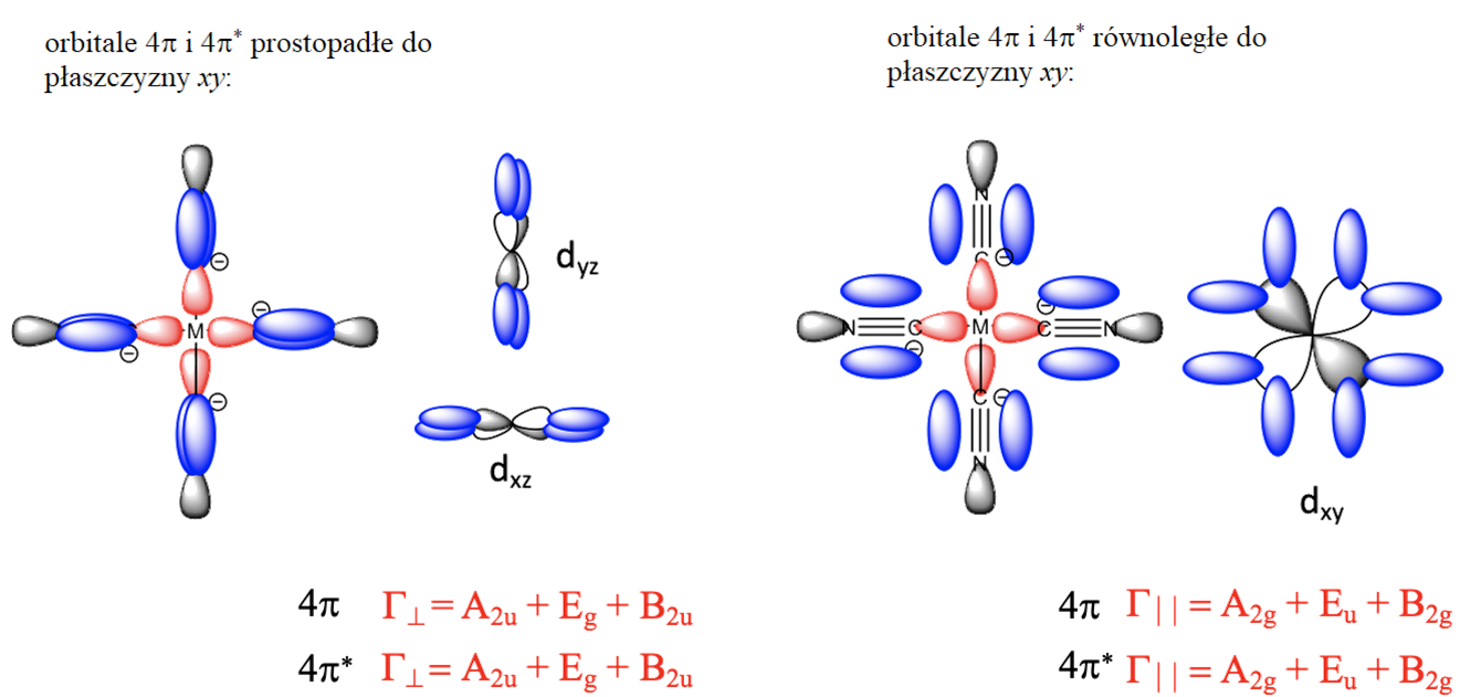 Przyjrzyjmy się teraz wiązaniu π w kwadratowym płaskim kompleksie metalu przejściowego. Dla liganda CN– orbitale, które mają odpowiednią symetrię, aby nakładać się z orbitalami metalu tworząc wiązanie π to orbitale 1e i 2e (π i π*) na diagramie MO dla CO. Ponieważ mamy cztery ligandy, w sumie mamy osiem orbitali π i osiem π*. Teraz musimy wziąć pod uwagę, że cztery z orbitali π znajdują się w płaszczyźnie xy, podczas gdy pozostałe cztery znajdują się powyżej i poniżej płaszczyzny xy. Te pierwsze nazywamy orbitalami równoległymi, a drugie prostopadłymi, ponieważ są zorientowane odpowiednio równolegle i prostopadle do płaszczyzny xy. Musimy je rozróżnić, ponieważ mają inną symetrię i inaczej nakładają się z orbitalami d metalu. Analogicznie zachowują się orbitale antywiążące. Zgrupujemy orbitale, aby utworzyć cztery zestawy orbitali ligandów π⊥, π||, π*⊥ i π*||. Naszym następnym zadaniem jest określenie typów symetrii tych orbitali. Zarówno π⊥, jak i π*⊥ zawierają jeden orbital o symetrii A2u, dwa Eg i jeden B2u; π|| i π*|| przekształcają się jako jeden A2g, dwa Eu i jeden B2g.