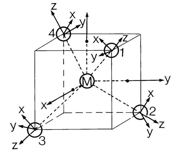 Wybieramy układ współrzędnych wpisując czworościan w sześcian, wstawiając w co drugi wierzchołek sześcianu ligand. Osie współrzędnych przebiegają prostopadle do ścian sześcianu.