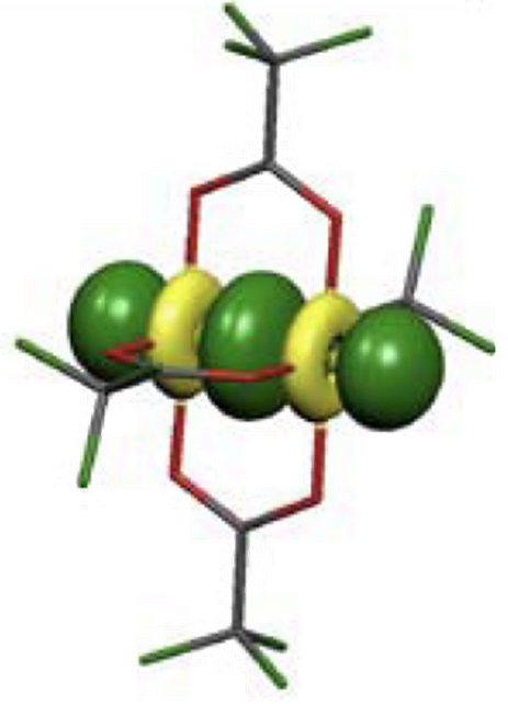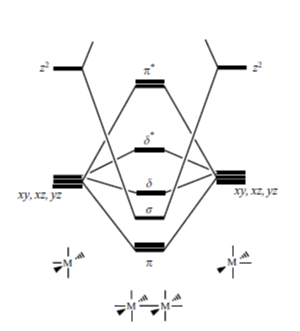 W związku z tym możemy skonstruować diagram orbitali cząsteczkowych dla dwujądrowego związku koordynacyjnego typu [M2L10], dla każdego jądra koordynującego ligandy [ML5] rozpatrując cztery najniżej energetyczne orbitale d. Ponieważ poziom t2g (orbitale dxz, dxy, dyz) jest potrójnie zdegenerowany to kolejność orbitali π i δ jest niejednoznaczna. Dodatkowo trudno też jednoznacznie określić położenie orbitalu σ; jego lokalizacja pomiędzy orbitalami π i δ wynika z założenia stosunkowo niedużej różnicy e