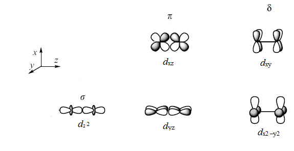 Wiązanie σ tworzy się w wyniku oddziaływania orbitali dz2 natomiast dwa wiązania π powstają przez kombinację orbitali dxz i dyz. Pojawia się trzeci typ wiązania, wiązanie δ, posiadające dwie płaszczyzny węzłowe, powstające w wyniku kombinacji orbitali dxy oraz dx2-y2. Biorąc pod uwagę wielkości nakładania poszczególnych orbitali można stwierdzić, ze najsilniejszym jest wiązanie σ, potem π, a wiązanie typu δ jest najsłabsze. Szacunkowo wartość całki nakładania dla tego wiązania wynosi około ¼ wartości dla wiązania π.