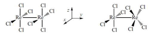 Istnienie wiązań poczwórnych w związkach koordynacyjnych po raz pierwszy zostało zaproponowane w roku 1965 przez Cottona w celu wyjaśnienia właściwości [Re2Cl8]2-. Odległość pomiędzy centrami metalicznymi w tym anionie wynosi 2.24 Å, czyli jest bardzo bliska tej wyznaczonej dla podanego powyżej [Re2Cl8(H2O)2]2-. Rozpatrując związek chlorkowy możemy założyć dwie prawdopodobne konformacje: