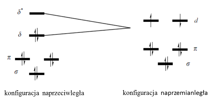 naprzeciwległą i naprzemianległą. Układ ten możemy rozbić na dwa fragmenty typu [ReCl4]- o geometrii płaskiego kwadratu. W takim wypadku orbital σ będzie niżej energetyczny niż orbital π w konfiguracji podanej powyżej dla związku z wiązaniami metal-metal (orbital dz2 przy geometrii płaskiego kwadratu jest niewiążący). Podobnie jak wyżej, ren ma konfigurację elektronową d 4, a związek w stanie podstawowym posiada konfigurację (σ)2(π)4(δ)2. Tak wygląda sytuacja dla konformacji naprzeciwległej. W przypadku konformacji naprzemianległej, w której jeden fragment jest obrócony w stosunku do drugiego o kat 45o wzdłuż osi z, pojawia się znacząca różnica w oddziaływaniu odpowiedzialnym za powstawanie wiązania δ. Otóż orbitale dxy i dx2-y2 obydwu fragmentów mają inną symetrię przez co ich nakładanie zostaje ograniczone i pojawia się poziom niewiążący obejmujący dwa orbitale d.