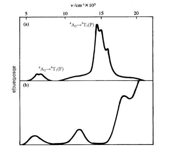 W silnym polu krystalicznym przejścia 4T1g(F)→4T2g i 4T1g(F)→4T1g(P) związane są ze wzbudzeniem jednego elektronu z poziomu t2g na eg natomiast przejściu pomiędzy termami 4T1g(F) i 4A2g odpowiada wzbudzenie dwóch elektronów pomiędzy poziomami t2g i eg. Ponieważ wzbudzenie dwóch elektronów jest mniej prawdopodobne niż przejście jednoelektronowe to i intensywność tego pasma jest znacznie niższa. Oczywiście, że w rzeczywistości przejście 4T1g(F)→4A2g nie jest czystym przypadkiem wzbudzenia dwuelektronowego i w związku z tym pasma te są obserwowane.