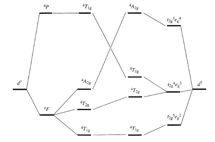 Dla trzech spinowo dozwolonych przejść 4T1g(F)→4T2g, 4T1g(F)→4A2g i 4T1g(F)→4T1g(P) pasmo odpowiadające przejściu pomiędzy termami 4T1g(F) i 4A2g wykazuje bardzo niską intensywność. Wyjaśnienie takiego stanu wymaga przeanalizowania diagramu Tanabe-Sugano dla konfiguracji d7, a szczególnie rozpatrzeniu w jaki sposób termy: 4T1g(F) w słabym polu krystalicznym korelują z konfiguracją t2g5eg2 w silnym polu ligandów, 4T2g(F) i 4T1g(P) z t2g4eg3 oraz 4A2g z konfiguracją t2g3eg4. Poniżej przedstawiono diagram korelacyjny termów kwartetowych dla konfiguracji d7.