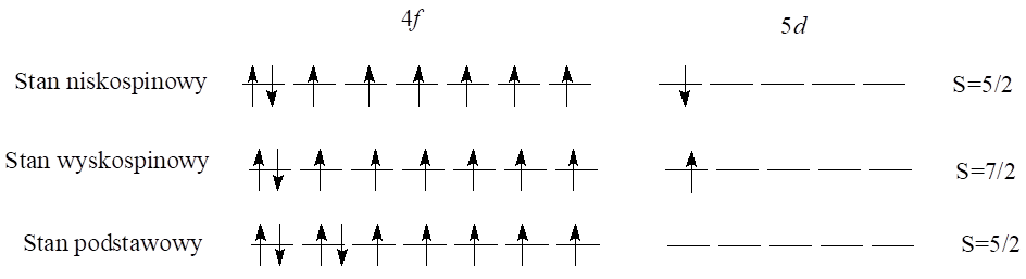 Różnice energetyczne pomiędzy stanami nisko- i wysokospinowymi dla jonów lantanowców na +3 stopniu utlenienia są zależne od rodzaju pierwiastka, ale największe wartości osiągają dla konfiguracji f8. Przykładowo: Tb3+ (4f8) 7990 cm-1; Dy3+ (4f9) 7380 cm-1; Ho3+ (4f10) 3460 cm-1; Er3+ (4f11) 3330 cm-1; Tm3+ (4f12) 2070 cm-1; Yb3+ (4f13) 1500 cm-1; Lu3+ (4f14) 800 cm-1.