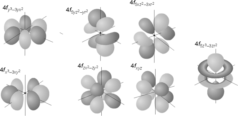 Poziom t1u tworzą orbitale fz(5z2-r2), fx(5x2-r2), fy(5y2-r2), t2u: fz(x2-y2), fx(y2-z2), fy(z2-x2), a poziom a2u zawiera orbital fxyz. Energie tych poziomów wynoszą odpowiednio 6Dq+20Fr, -2Dq-36Fr oraz -12Dq+48Fr. Obniżenie symetrii powoduje dalsza zmianę degeneracji orbitali f, a tym samym pojawienie się szeregu dodatkowych parametrów. Termy podstawowe w przypadku izolowanych jonów metali f-elektronowych są następujące: f1, f13 – 2F5/2,7/2, f2, f12 – 3H4,6, f3, f11 – 4I9/2,15/2, f4, f10 – 5I4,8, f5, f9 – 6H5/2,15/2, f6, f8 – 7F0,6, f7 – 8S7/2. Ponieważ oddziaływanie elektronów (n-1)f (ekranowanych przez elektrony zajmujące orbitale ns i np) z ligandami jest słabe, to wpływ pola krystalicznego można traktować jako zaburzenie przy rozpatrywaniu poziomów energetycznych jonów metali f-elektronowych. Jednak wzajemne oddziaływanie elektronów (n-1)f i nd jest na tyle duże, że jego wpływ, powodujący znaczne zwiększenie parametru rozszczepienia, należy uwzględnić przy rozpatrywaniu zmiany degeneracji podpowłoki nd. Przykładowo dla jonu Ce3+ w tetragonalnym polu krystalicznym wartość parametru 10Dq dla orbitali d można oszacować na około 30 000 cm-1.