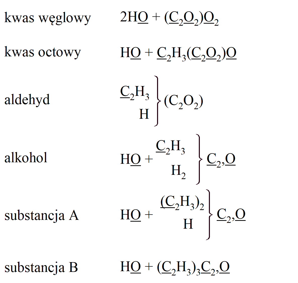 Zasadowość kwasu zależy od liczby atomów tlenu poza rodnikiem C2O2; aby to zaznaczyć dodaje się równe ilości równoważnika wody, HO. Substancja A jest zwykłym alkoholem z jednym wodorem podstawionym metylem; substancja B jest alkoholem z dwoma wodorami podstawionymi metylami. Teraz porównajmy produkty utlenienia substancji A z produktami utlenienia alkoholu etylowego: