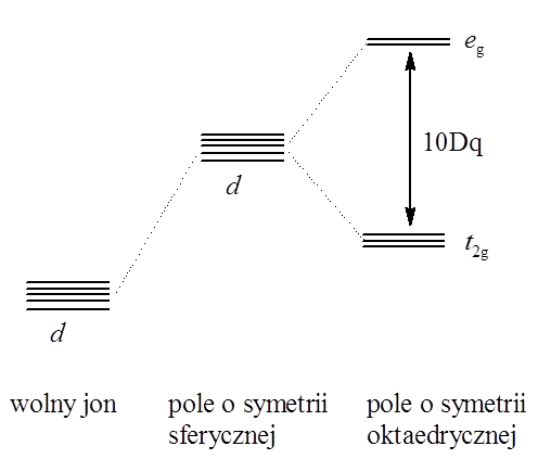 Orbitale d izolowanego atomu centralnego posiadają taką samą energię, czyli poziom nd jest pięciokrotnie zdegenerowany. Gdy atom centralny (o konfiguracji d5 lub d10) znajdzie się w otoczeniu ligandów, w polu o symetrii sferycznej, energia wszystkich pięciu orbitali d ulega zwiększeniu. Zmiana symetrii pola spowodowana obecnością ligandów w związku koordynacyjnym prowadzi do zmiany degeneracji orbitali d.